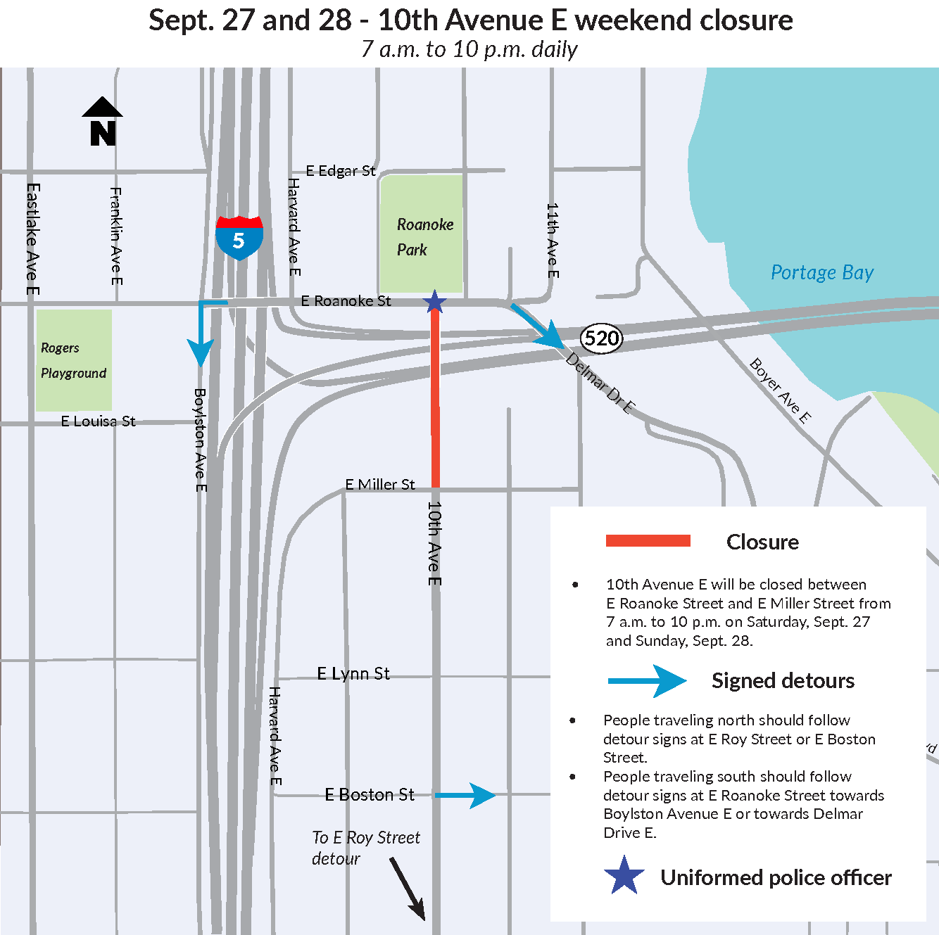 10th Ave. E. between E. Roanoke St. and E. Miller St. closed Sept. 27 & 28